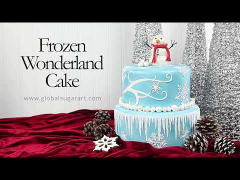 Lean how to airbrush icy blue shimmer and wind-swept cake lace snowflakes across this Frozen Wonderland Cake! Top with an adorable fondant snowman and snowballs, sprinkle with Snow Sparkle dust and Let It Snow!