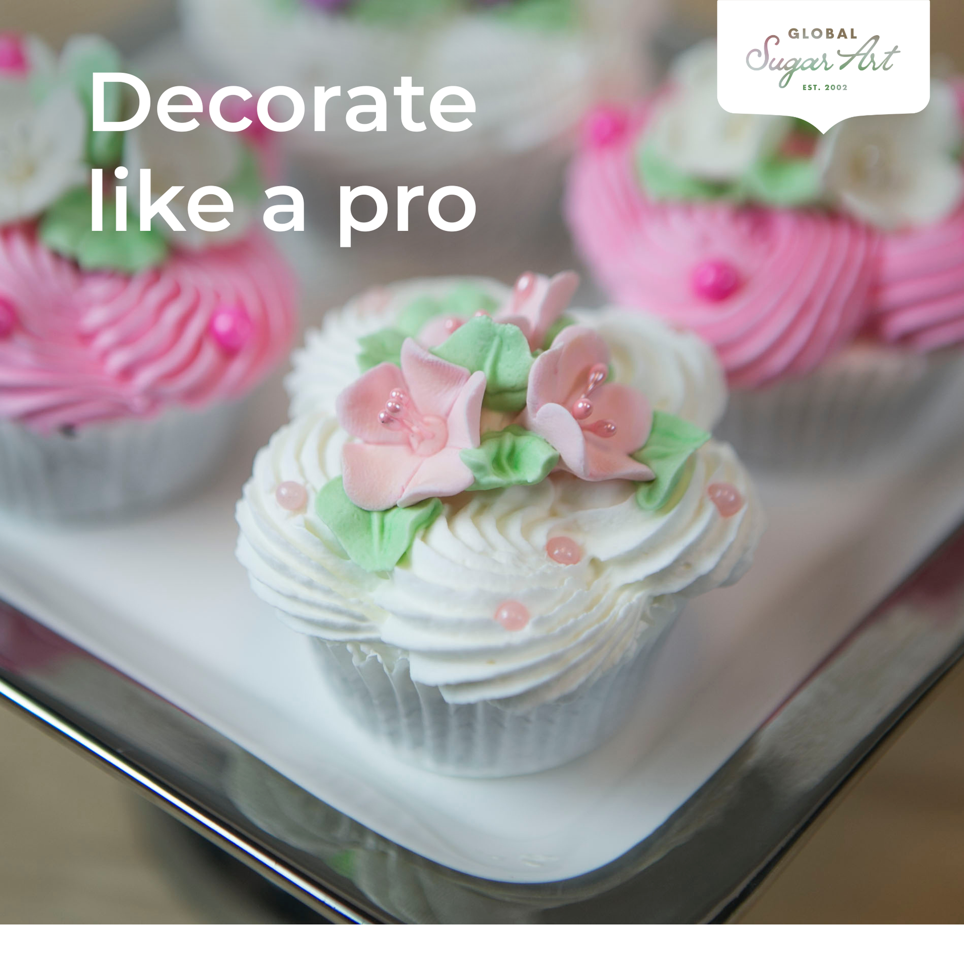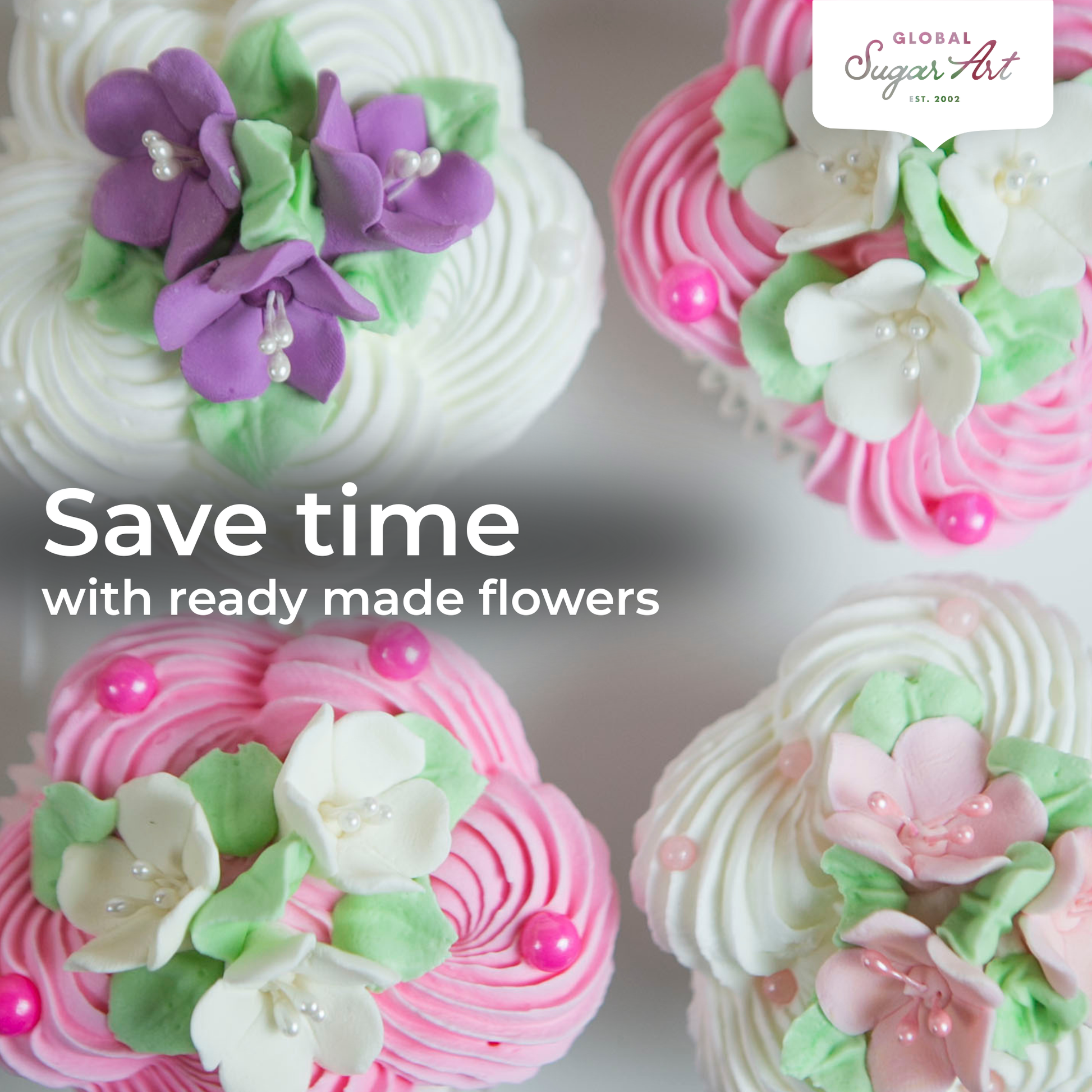 Global Sugar Art mini gum paste blossoms with wired pearl stamens are hand-crafted, ready-to-use sugar flowers used by cake decorators to add delicate, jeweled floral accents to wedding cakes, tiered cakes, and special occasion desserts – no flower-making skills required.