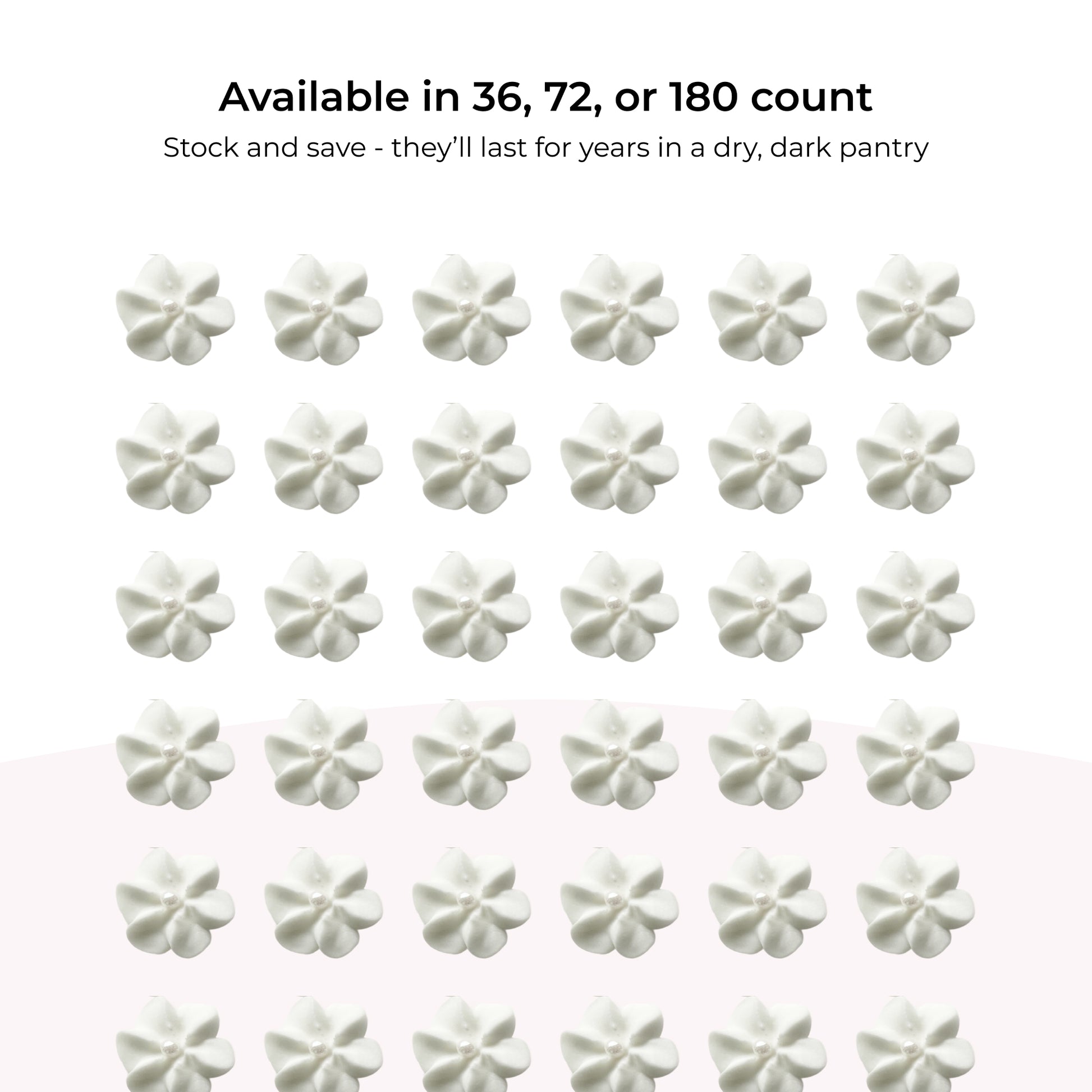 - Each flower features a delicate pearl center for an elegant, finished look – place directly onto frosted cupcakes, cakes, cookies, or chocolates.